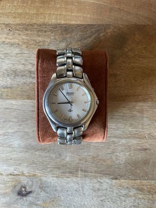 Elegante reloj Seiko Kinetic con una esfera blanca y detalles plateados. - Diseño moderno y sofisticado. - Pulsera de eslabones plateada.