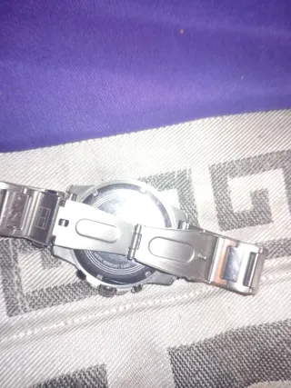 Reloj de pulsera con un diseño moderno y robusto. - Esfera con detalles en azul y morado. - Correa de eslabones metálicos. - Resistente a golpes. - no dispone de caja