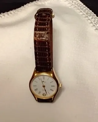 Elegante reloj de pulsera con correa de piel. - Esfera blanca con detalles dorados. - Correa de piel con textura. - Cierre de hebilla.