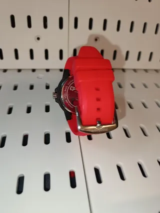 Reloj de pulsera con un diseño moderno y deportivo. - Usados dos veces. - Necesita cambio de pila. - Correa de silicona en color rojo. - Caja de reloj en color negro. - Resistente al agua hasta 50 metros.