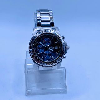Reloj de pulsera con un diseño deportivo y funcional. - Esfera plateada con detalles en negro y amarillo. - Correa combinada de eslabones metálicos y caucho negro. - Bisel giratorio unidireccional con marcadores. - Indicadores de hora y minutos con agujas luminiscentes. - Subesferas para cronógrafo y fecha.
