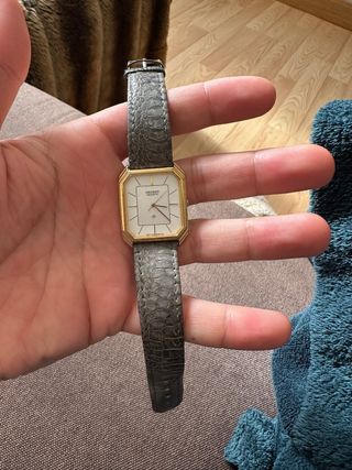 Reloj de pulsera con un diseño elegante y moderno. - Correa de piel con textura. - Caja octogonal dorada. - Esfera rectangular con detalles en negro. Hay que cambiarle la pila