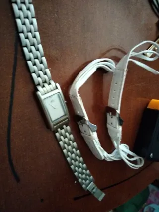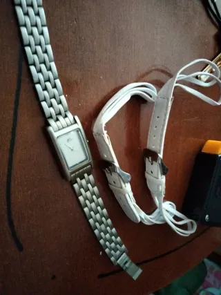 Reloj de pulsera con un diseño elegante y dos juegos de correas.a 2 euros cada una - Correa de metal plateado. 20 cm - Correas de cuero blanco.a 18 cm