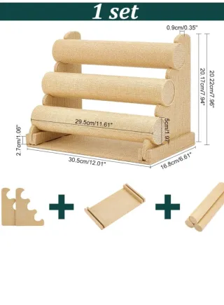 Expositor de tres niveles para organizar pulseras, relojes y otras joyas. - Material: Lino y madera. - Color: Beige y marrón. - Dimensiones: 30.5 cm (largo) x 16.8 cm (ancho) x 20.22 cm (alto). - Diámetro de los soportes: 5 cm.