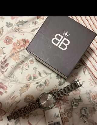 Elegante conjunto de reloj y pulseras en tono oro rosa. - Diseño con detalles brillantes. - Pulsera de eslabones entrelazados. - Cadena delicada con charms. En Amazon se vende a 101€. Se ha usado en una sola ocasión