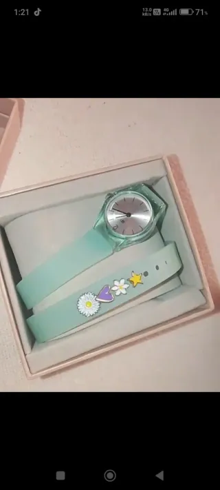 Precioso reloj de pulsera con un diseño juvenil y divertido. La correa es de color verde agua y tiene varios adornos. - Adornos de corazón morado, margarita y estrella amarilla. - Esfera plateada.