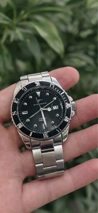 Reloj de pulsera con diseño deportivo y elegante. - Caja y brazalete de acero inoxidable. - Esfera negra con detalles luminiscentes. - Resistente al agua 100 metros.