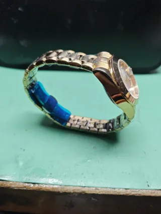 Elegante reloj de pulsera para mujer con un acabado dorado brillante. Un accesorio clásico y sofisticado. Nuevo extreno, se entrega con pila nueva. Solo venta, no regateos. Calendario y semanario. - Diseño con detalles de pedrería en la esfera. - Indicador de día y fecha. - Movimiento de cuarzo.