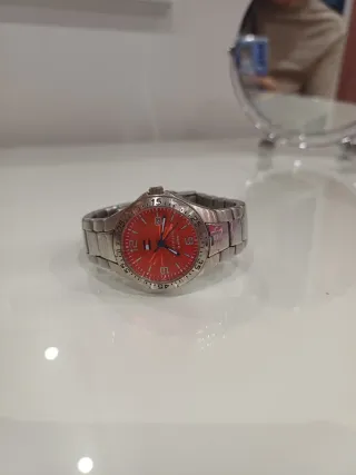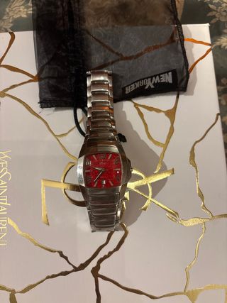Elegante reloj de pulsera con esfera roja y detalles plateados. - Diseño moderno y llamativo. - Correa de metal. - Bisel con marcadores de tiempo.
