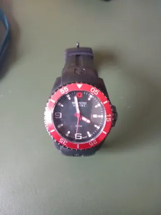 Reloj de pulsera con un diseño deportivo y moderno. - Bisel giratorio en color rojo. - Correa de caucho negra. - Esfera oscura con detalles en rojo.