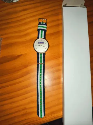 Reloj de pulsera con un diseño elegante y moderno. La correa combina rayas de colores azul marino, blanco y verde, con detalles dorados en la hebilla y la caja. - Correa de tela con diseño de rayas. - Caja de metal en tono dorado. - Cierre de hebilla ajustable.
