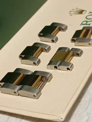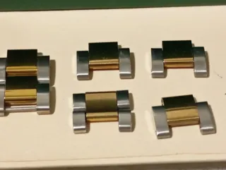 Conjunto de eslabones para pulsera de reloj. - Diseño bicolor: oro y plata. - Piezas de repuesto o para personalizar tu reloj. Precio por unidad.