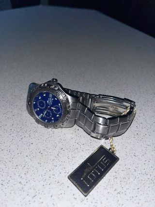 Reloj de pulsera con esfera azul y detalles plateados. - Diseño multifunción. - Resistencia al agua de 330 ATM.