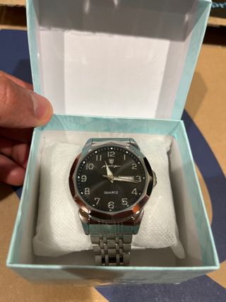 Reloj de pulsera con un diseño elegante y moderno. - Esfera negra con detalles dorados. - Correa de metal. - Resistente al agua. Tiene un pieza despegada pero se puede pegar sin problema (última foto)
