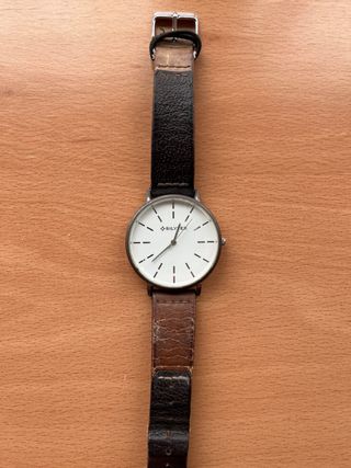 Reloj de pulsera con correa de cuero. - Esfera blanca con detalles. - Correa combinada en negro y marrón.