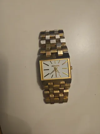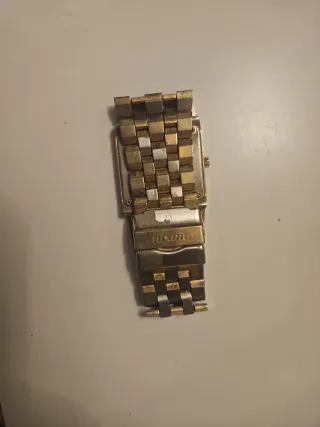 Reloj de pulsera con un diseño elegante y moderno. - Combinación de colores dorado y plateado. - Correa con eslabones. - Esfera rectangular.