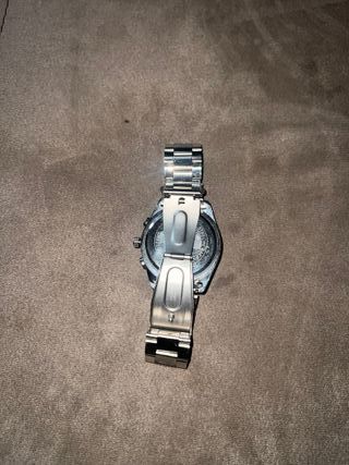 Reloj de pulsera Lotus en buen estado. - Esfera negra con detalles naranjas. - Correa de eslabones plateada.