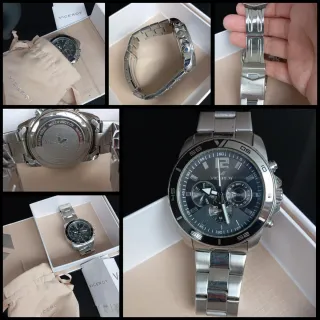 Reloj de pulsera con diseño deportivo y elegante. - Esfera en tonos negro y plateado. - Correa de metal. - Bisel con escala taquimétrica.