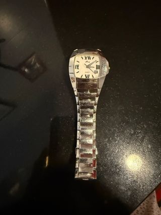 Reloj de pulsera con diseño elegante. - Esfera blanca. - Brazalete de eslabones plateados. - Incluye eslabón adicional. Uno de los laterales de la tercera está suelto, pero con un arreglo sencillo.