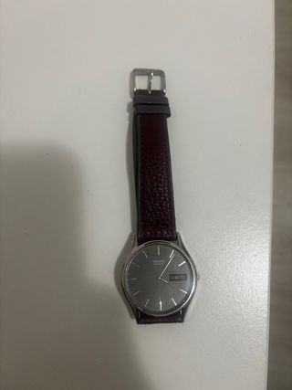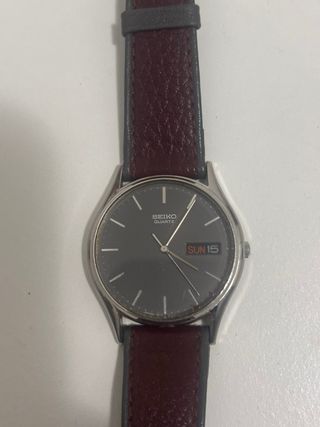 Reloj de pulsera Seiko Quartz con correa de cuero. - Esfera gris. - Correa de cuero marrón. - Indicador de día y fecha.