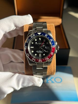 El SEIKO MOD GMT PEPSI es un reloj de pulsera con un diseño inspirado en el clásico GMT. La caja de acero inoxidable tiene un acabado brillante y un bisel fijo. El dial es de color azul y rojo, similar al de la lata de Pepsi. Cuenta con un movimiento mecánico automático y una resistencia al agua de 100 metros.
