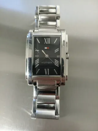 Reloj de pulsera para hombre de la marca Tommy Hilfiger. Un accesorio elegante y moderno. - Esfera negra con detalles plateados. - Correa de eslabones plateada. - Diseño rectangular.