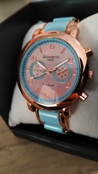 Elegante reloj de pulsera Giovanni Milano con detalles en azul y dorado. Incluye pila nueva. - Diseño moderno y llamativo. - Correa de eslabones en color azul. - Caja y detalles en tono dorado.