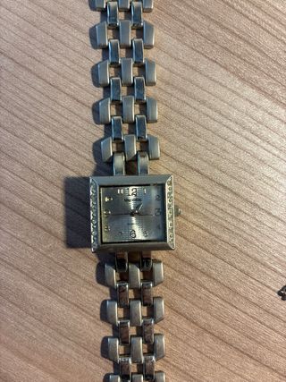 Elegante reloj de pulsera con un diseño moderno. - Correa de eslabones plateados. - Esfera cuadrada con detalles brillantes en el bisel. - Cierre de seguridad. - Hay que cambiar la pila
