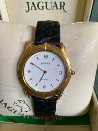 Elegante reloj de pulsera de la marca Jaguar. - Esfera blanca con detalles dorados. - Correa de piel negra con textura. - Mecanismo de cuarzo.