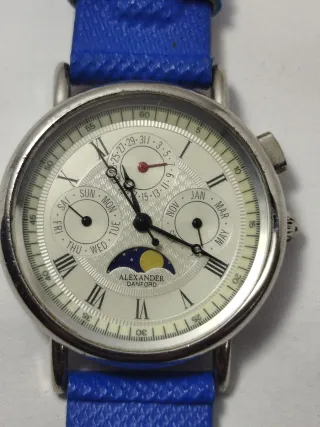 Elegante reloj de pulsera Alexander Danford con múltiples complicaciones y una esfera detallada. - Correa de piel azul. - Caja de acero plateada. - Indicadores de día, mes y fase lunar.