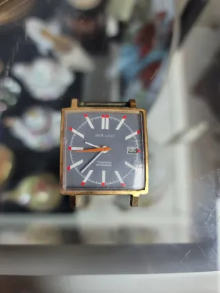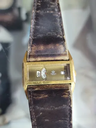 Reloj de pulsera con un diseño rectangular y correa de cuero. - Caja dorada. - Correa de cuero marrón. - Esfera con detalles en blanco y dorado.Escucho Ofertas Razonables