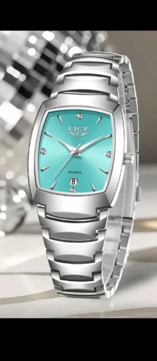 Elegante reloj de pulsera con un diseño moderno y sofisticado. - Esfera de color turquesa vibrante. - Correa y caja de acero inoxidable en tono plateado. - Detalles de pedrería en la esfera. Nuevo a estrenar, con pila y funcionando , no bajo mas