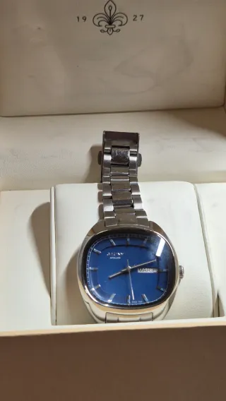 Elegante reloj de pulsera con esfera azul y detalles plateados. - Diseño clásico y atemporal. - Correa de metal plateado. - Indicador de día de la semana. Modelo Apollon. Incluye su caja y garantía. Muy buen estado.