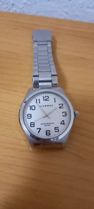 Reloj de pulsera Viceroy con diseño clásico y elegante. - Esfera blanca con números negros. - Correa de metal plateada. - Resistente al agua hasta 150 pies.