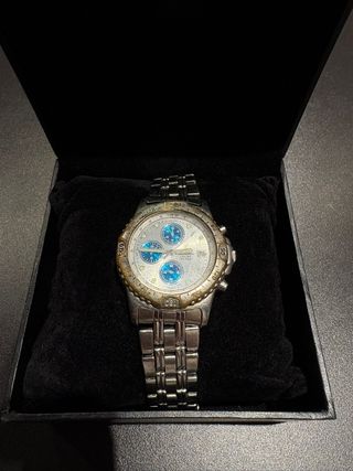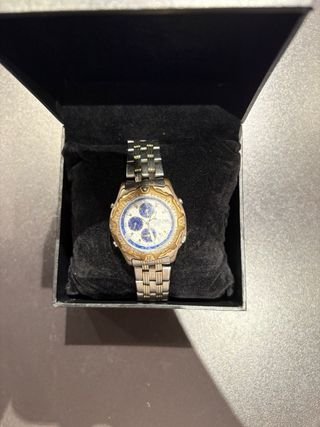 Elegante reloj de pulsera con una combinación de tonos dorados y plateados. Presenta una esfera detallada con múltiples subesferas. - Diseño de cronógrafo. - Correa de eslabones metálicos.