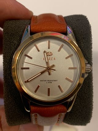 Elegante reloj de pulsera para mujer de la marca Marea. Un accesorio que combina estilo y funcionalidad // bicolor - Correa de piel en tono marrón. - Detalles y bisel en color dorado. - Resistente al agua hasta 3 ATM.