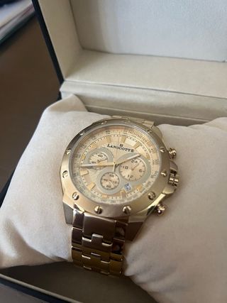 Elegante reloj de pulsera con acabado dorado. - Diseño tipo cronógrafo. - Brazalete metálico. - Presentado en su caja original.