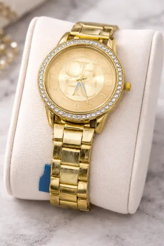 Elegante reloj con un diseño llamativo. - Bisel adornado con brillantes. - Pulsera de eslabones dorados.
