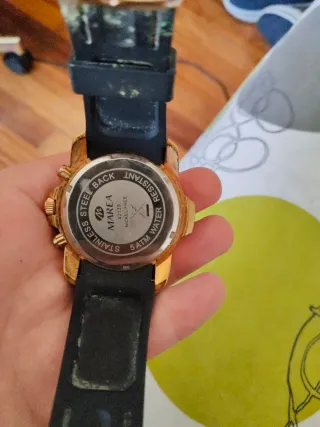 Reloj de pulsera con un diseño elegante y moderno. - Correa de silicona negra. - Bisel y detalles en tono dorado. - Esfera negra con indicadores dorados. - resistente al agua - esta en su paquete original. No se ha estrenado porque le regalaron otro igual 😅