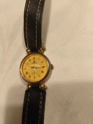 Reloj clásico de la marca Potencial, modelo Quartz 66653-886. Caja posiblemente de acero chapado en oro, aunque el chapado está desgastado por el uso. La parte trasera indica "Stainless Steel Back". La esfera está en buen estado, sin rayaduras aparentes. Tiene una correa de cuero marrón, bastante usada pero funcional. No tiene pila actualmente, pero funciona correctamente. Ideal para coleccionistas o amantes de los relojes vintage.