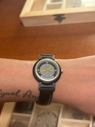 Reloj de pulsera con diseño clásico en muy buen estado, es perfecto para coleccionar. Con gran valor y muy bien cuidado. - Correa de cuero negra original. - Esfera gris con detalles en amarillo. - Indicador de fecha. - Vintage y muy raro de ver, con serigrafía I LOVE RADIANT.