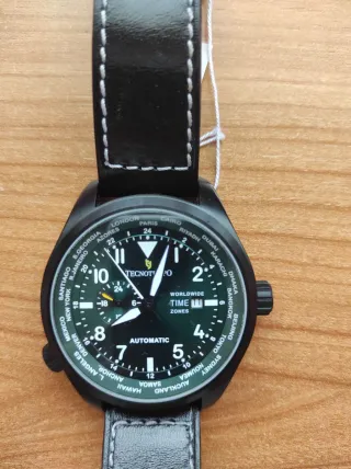 Reloj de pulsera con correa de cuero negra y esfera verde. - Diseño con indicación de múltiples zonas horarias. - Mecanismo automático.300m - Correa de cuero con pespuntes blancos.Garantia oficial, le queda año y medio.