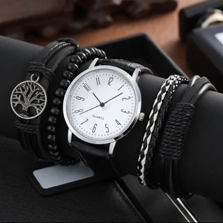 Pack reloj de hombre con correa de tela marron y 3 pulseras de cuero. Reloj de esgera negra con numeros romanos en color cobre. Preguntar por la caja. Se hacen envíos, también entrega en mano en Plaza Castilla y Alcobendas.