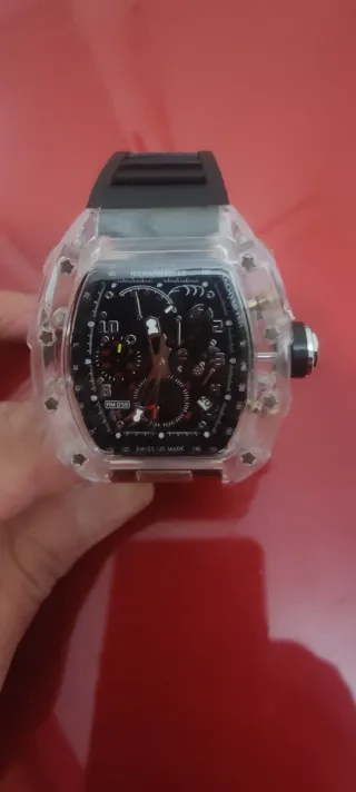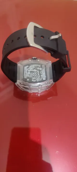 Reloj de pulsera con diseño transparente y correa negra. - Esfera negra con detalles en rojo y blanco. - Indicadores horarios y manecillas doradas. - Correa de caucho negra. - Caja transparente. - Cierre de hebilla.
