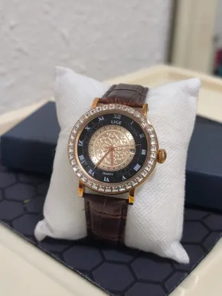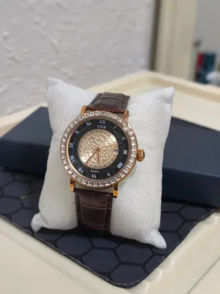 Elegante reloj de pulsera con correa de cuero. - Bisel adornado con pedrería. - Esfera con detalles dorados. - Correa de cuero marrón. - Cierre de hebilla.