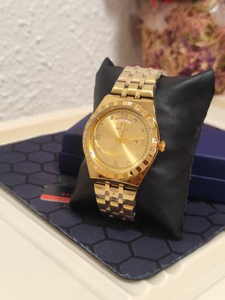 Elegante reloj de pulsera con un llamativo diseño. - Esfera con detalles dorados. - Correa resistente y cómoda. - Bisel con diseño deportivo.
