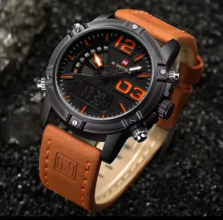 Reloj de pulsera con diseño moderno y correa de cuero. - Esfera analógica y digital. - Correa de cuero marrón. - Caja de color negro.