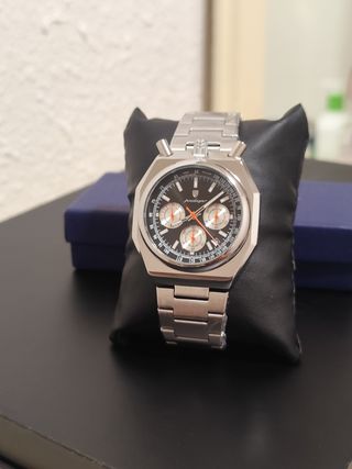 Elegante reloj de pulsera con diseño deportivo y esfera negra. - Caja y brazalete de acero inoxidable. - Cronógrafo con subesferas. - Bisel con escala taquimétrica.