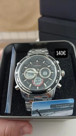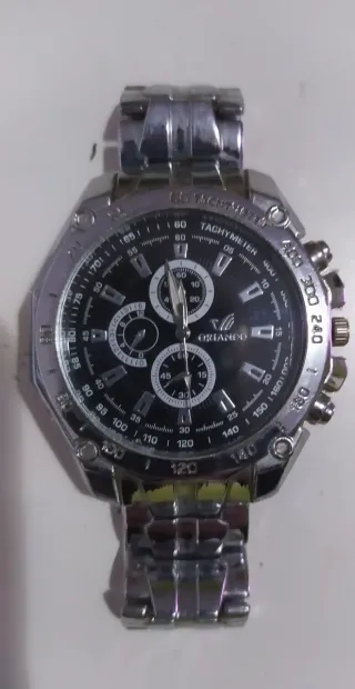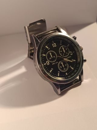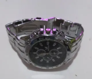 Reloj de pulsera con diseño deportivo y elegante. - Esfera negra con detalles plateados. - Correa de eslabones plateada. - Bisel con escala taquimétrica. Está perfecto y funciona correctamente , solo se le gastó la pila. Está en tarragona. Más cosas a la venta en mi perfil.
