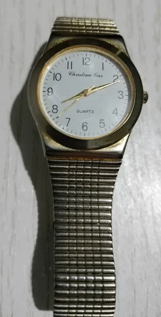 Elegante reloj de pulsera con esfera dorada. - Indicador de día y fecha. - Brazalete combinado en tonos plateados y dorados. Funciona correctamente. No presenta ningún daño o rascada. Para uso diario, es resistente.